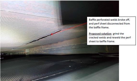 The SVI Dynamics inspection team offered temporary repairs to prevent any safety issues that could result from baffle deterioration and perforated sheets breaking off. The temporary solution was to grind the cracked welds and reweld the perforated sheets to the baffle frames. When the perforated sheets become disconnected from the baffle frame, small parts of the sheets get ejected outside the stack during operation and cause safety issues. Additionally, SVI recommended replacing the existing baffles with new baffles within one year to prevent any major safety issues or emergency shutdown. SVI proposed a new silencer baffle design that would eliminate the high frequency set simplifying the system while maintaining acoustical performance, optimizing velocities, and reducing system pressure drop.