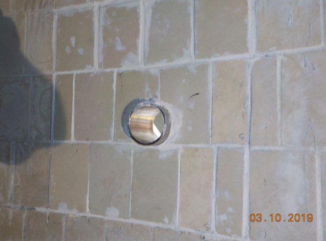 The inspection found the acid bricks of the interior walls hard and well-bonded, except for the area from course 81 to 120, where the faces of the bricks were worn from ¼” to 3/8”.
