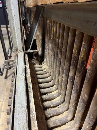A key aspect of the project was the fabrication of new tube bends to precise dimensions for reinstallation. Because of the age of the boilers, no tube drawings were available, so tube sections were cut out and transported to a tube vendor who used them as a template to ensure that replacement tubes were bent to the correct angles. Figure 3 shows a row of newly installed tube sections.