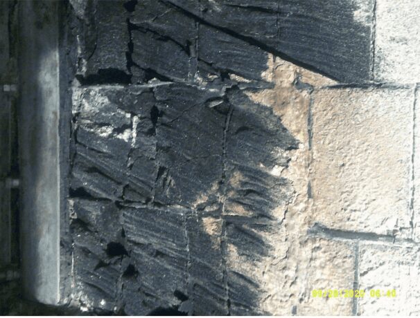 The inspector found the block was hard and well bonded on the wall. However, there were 30 damaged bricks on the south wall. The mastic joints were hard and full.