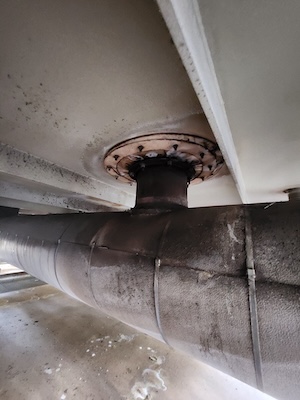 A penetration seal problem may be noticed during operator walk-downs. Escaping gases create hot spots in the casing, causing blistered paint, discoloration, or heat. Because exhaust temperatures vary, surface heating can occur quickly once containment fails. These signs often mean gases are bypassing the seal and overheating the outer steel. When observed, further evaluation is needed—not just cosmetic repair.